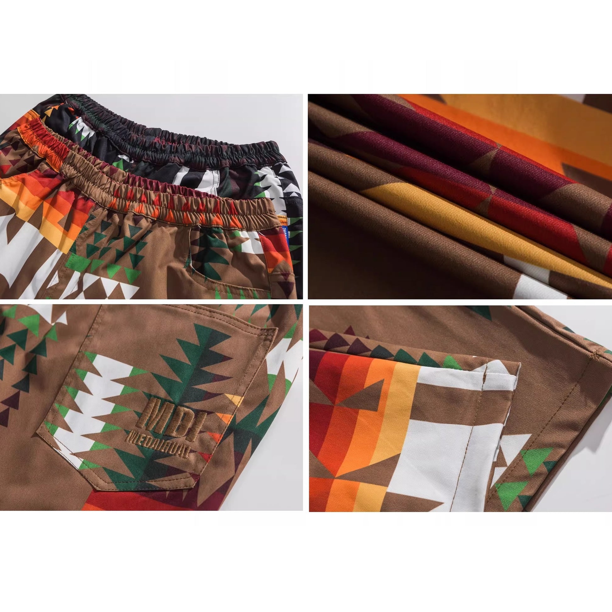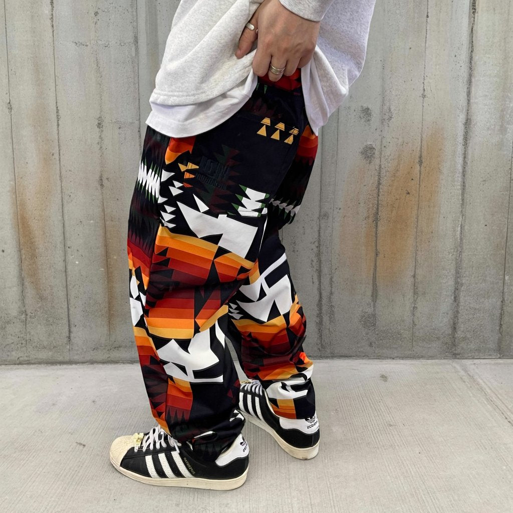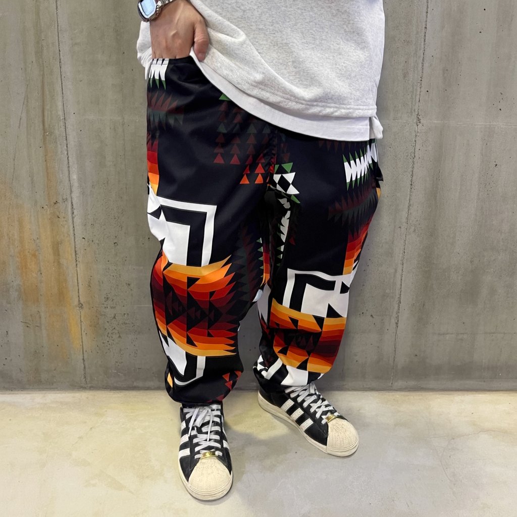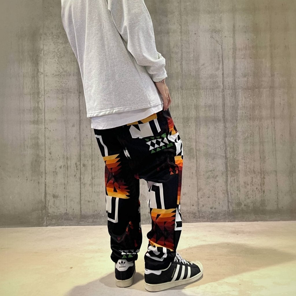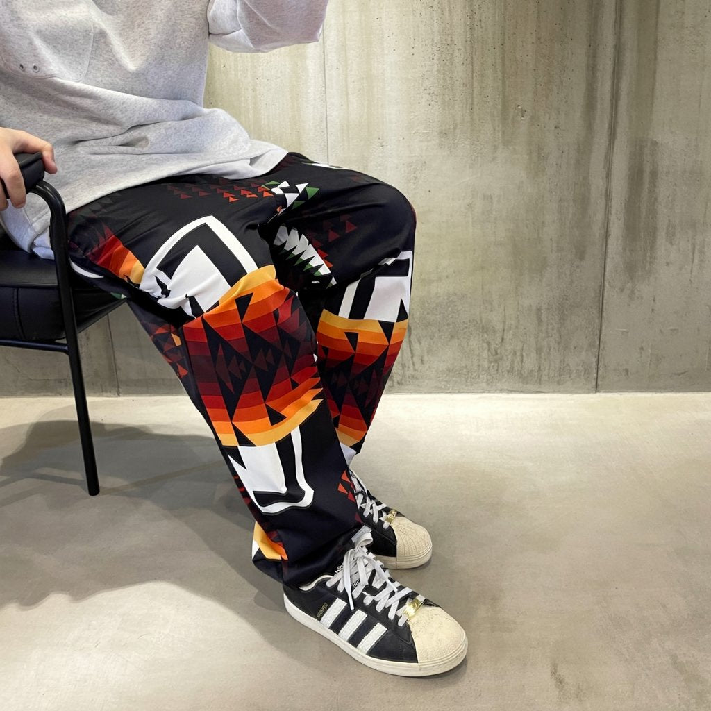 幾何学モチーフを全面に配した、存在感のある総柄デザインのワイドシルエットパンツ。
