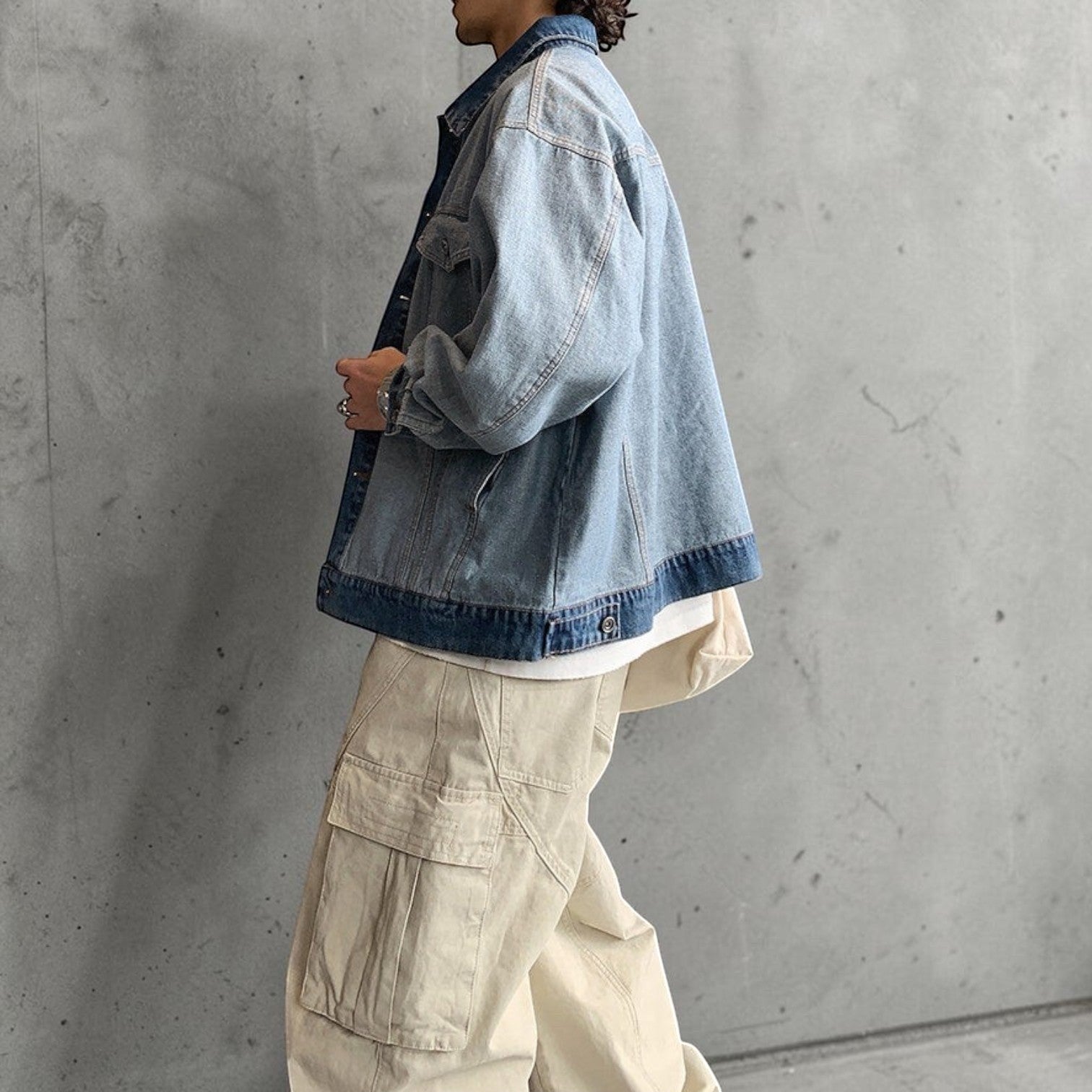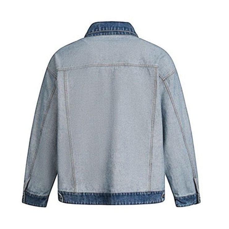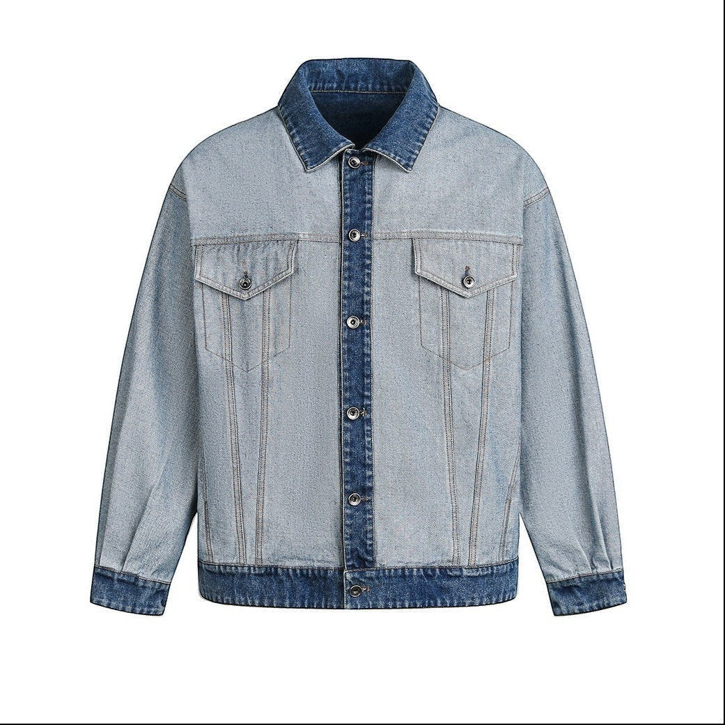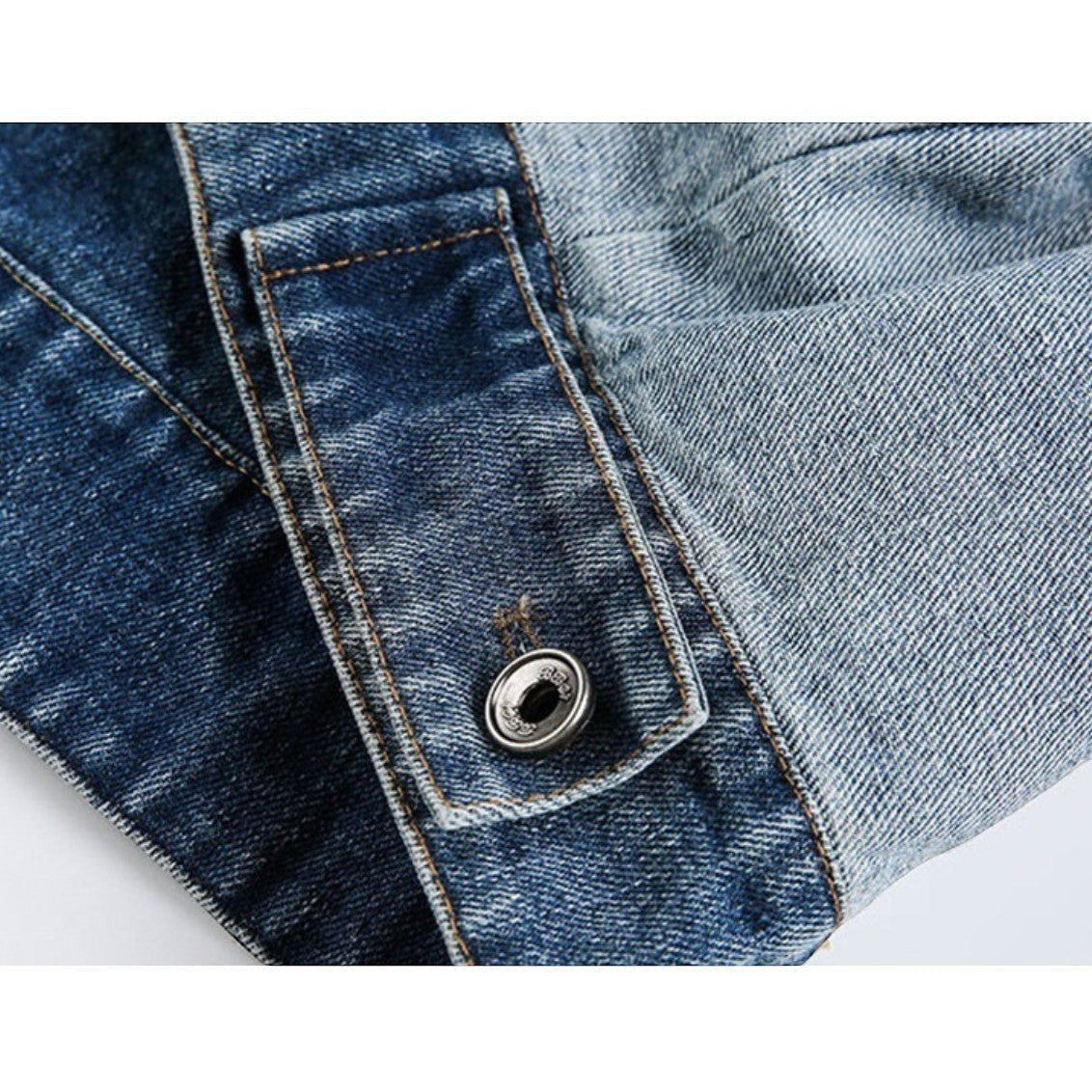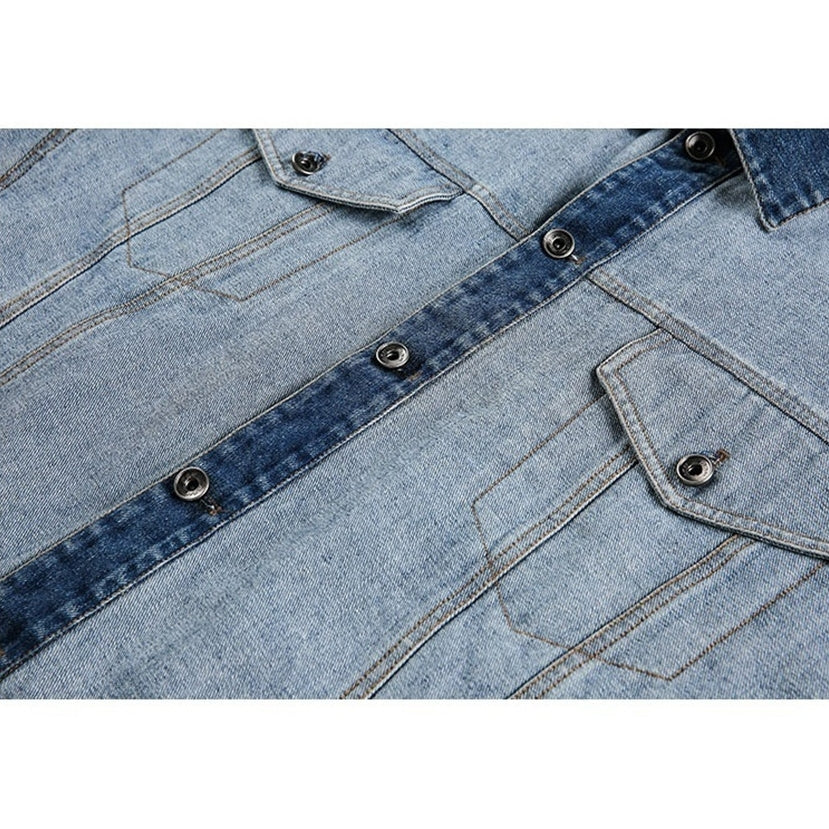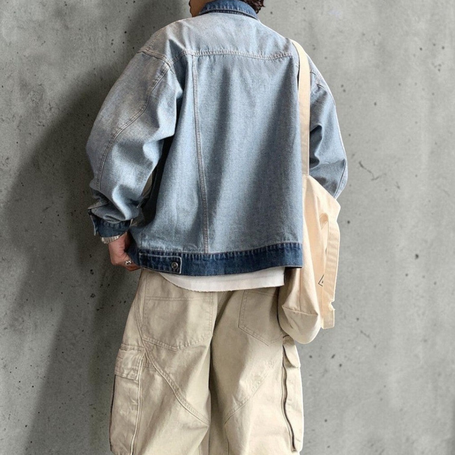 ライトブルーとインディゴを切り替えたバイカラーデザインが目を引くデニムジャケット。